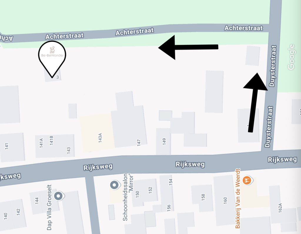 Be-Bewonder is gevestigd op Rijksweg 143 in Gronsveld, maar bereikbaar via de achterzijde (Achterstraat 3) zoals op onderstaande afbeelding te zien. Hier kunt u achter de grijze openstaande poort parkeren.
